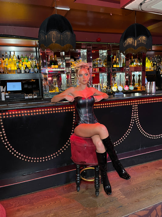 HAUNT COUTURE: Black zip up pvc corset set (corset and shorts)