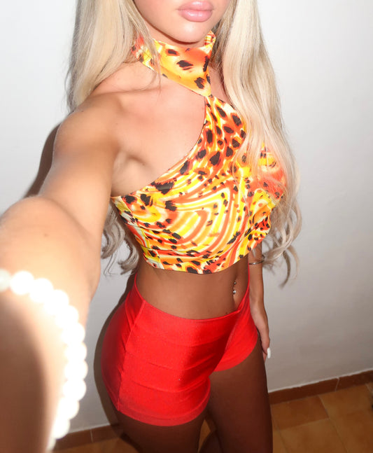 LIMITED EDITION HAND MADE AND DESIGNED IN HOUSE: Red slinky hot pant shorts